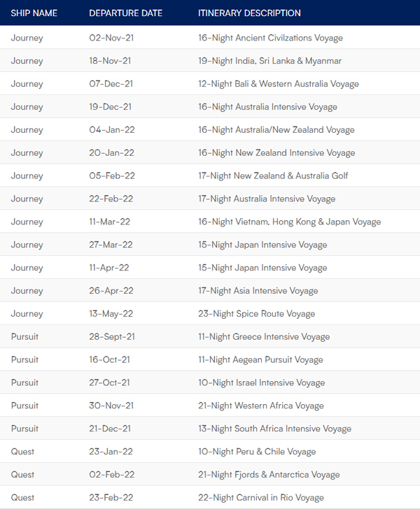 We’ve made the difficult decision to replace many sailings between September 2021 – May 2022 due to the ongoing complexities of cruise operations in Latin America and Australia. In addition, the conditions in certain parts of the Middle East and Western Africa are not conducive to cruise operations leaving us no choice but to cancel Azamara Pursuit voyages until January 2022. We’re truly sorry for this inconvenience and are grateful for you and your clients patience through this pandemic.